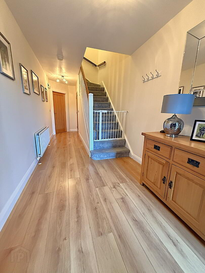 Entrance hall- A bright entrance hall featuring laminate oak affect flooring.