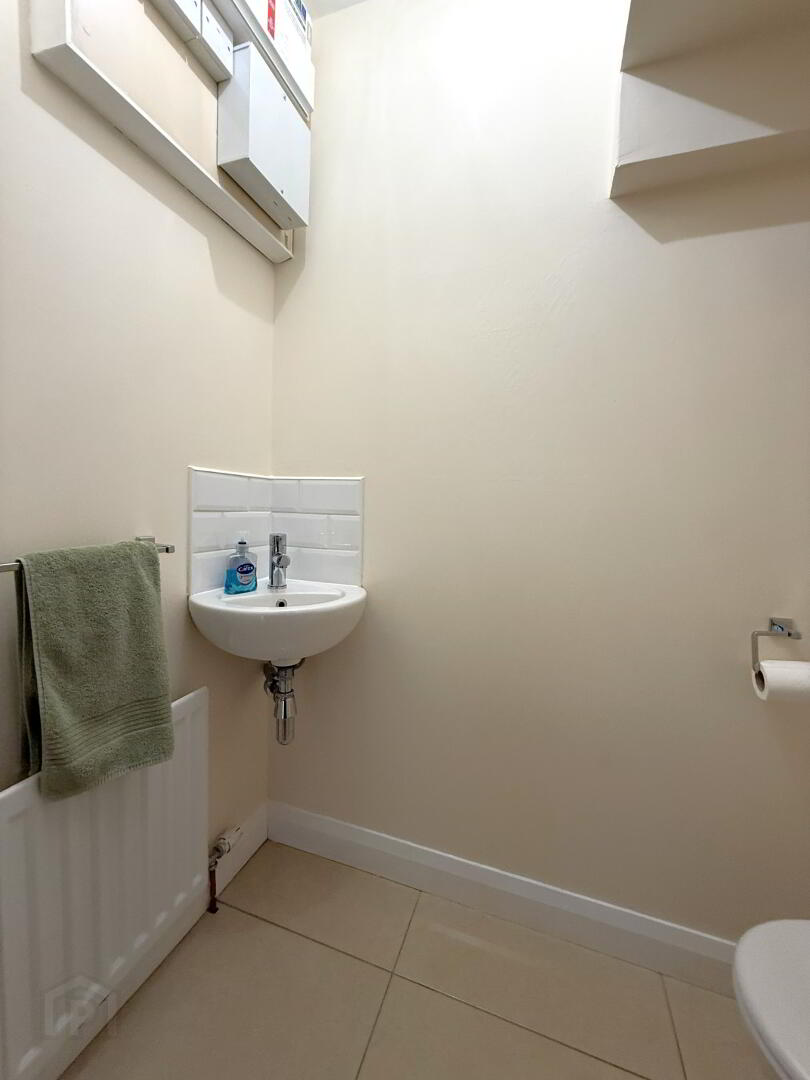 Under stair toilet. Wc, wall mounted wash hand basin, tiled flooring and splash back.