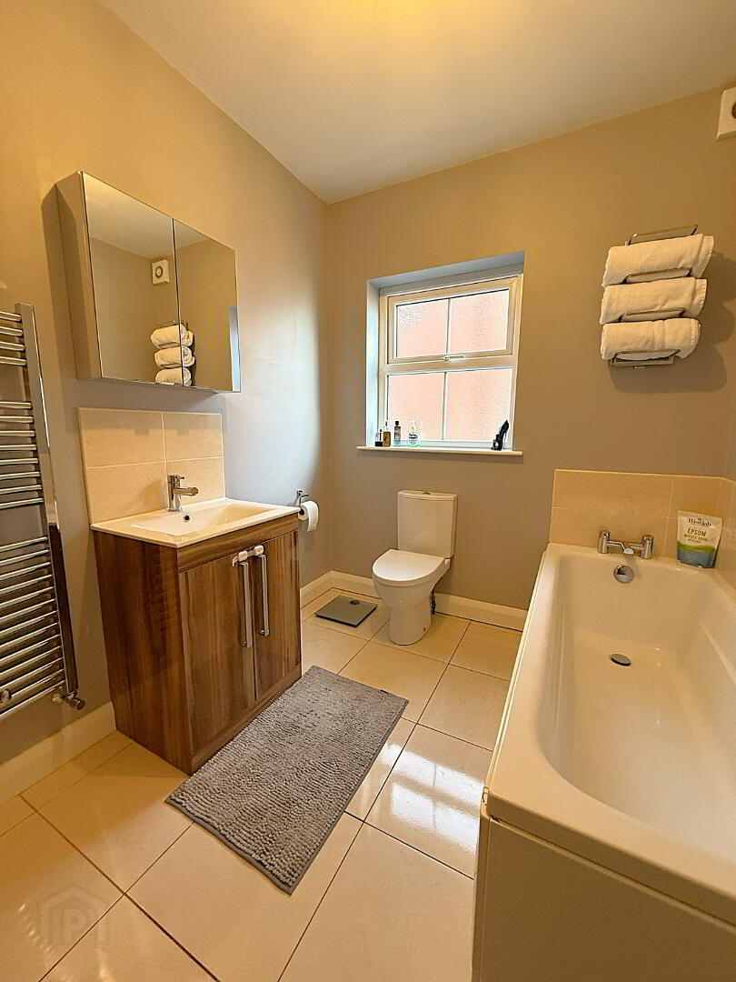 Bathroom 4 piece suite comprised of WC, vanity unit with basin, bath, shower cubicle, tiled floor and splash back, chrome towel rail and extractor fan.