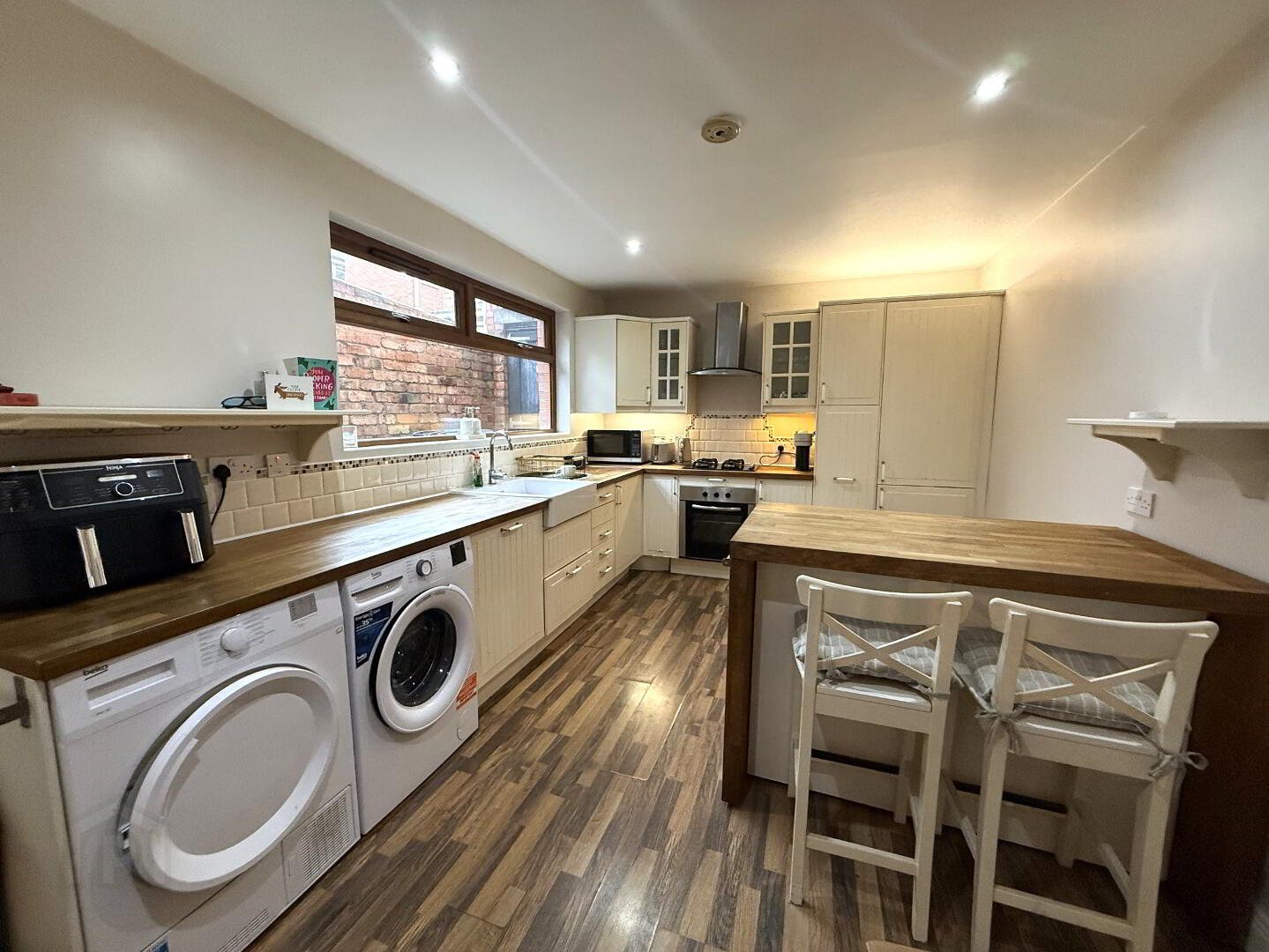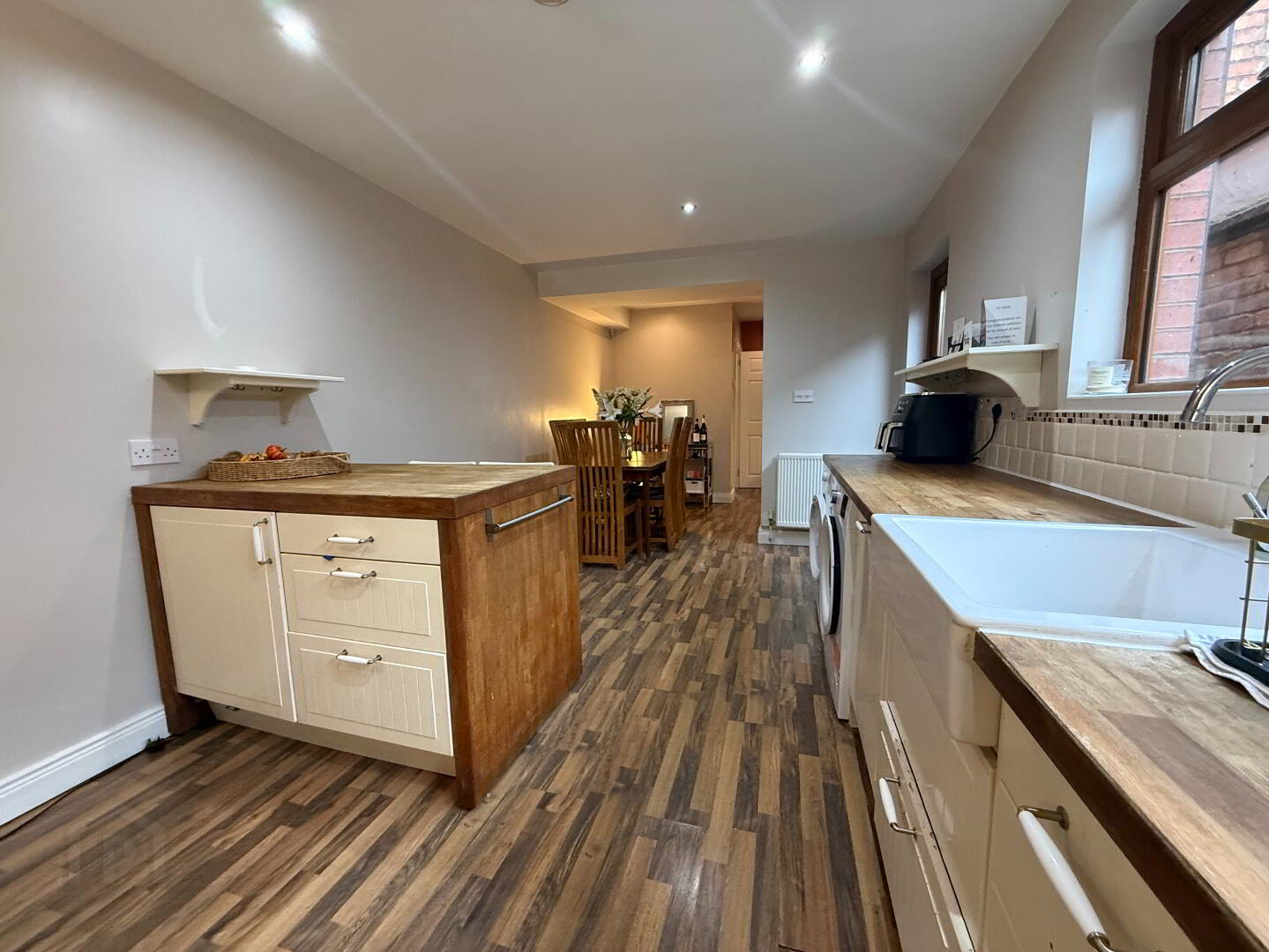 Open plan dining area which flows through to the modern fitted kitchen (5.35m x 3.02m). Shaker style fitted kitchen with a good range of high- and low-level units with feature island, laminate wooden effect flooring, Belfast style sink, gas hob, extractor fan, tiled splash back, integrated fridge and freezer and built in washing machine. Pvc back door to rear yard.