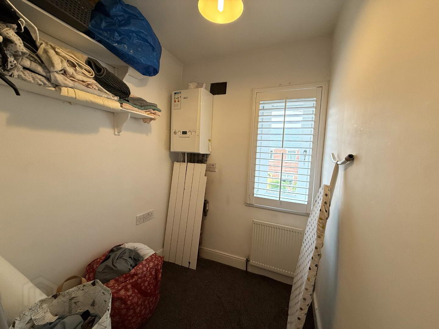 Box room – (1.88m x 1.65m) Carpet flooring, shelving, shutter windows, boiler in room with storage.