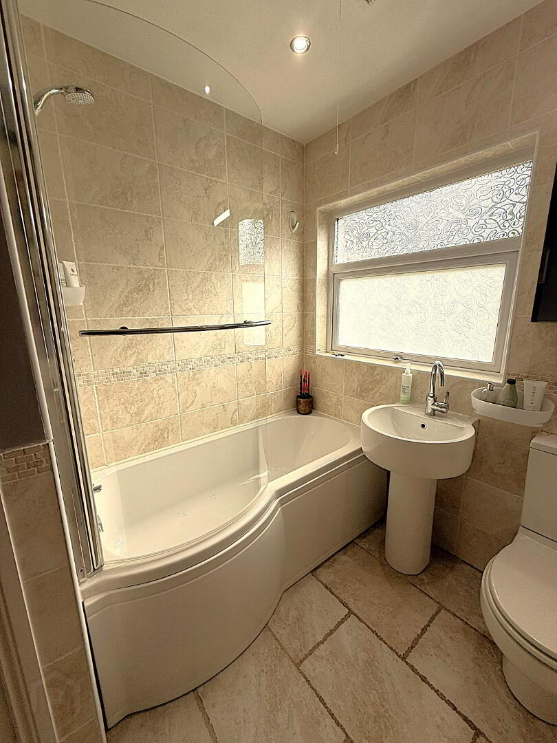 Bathroom. Comprising WC, wash hand basin and bath with shower door, tiled floor and walls, extractor fan, hot press with gas boiler, recessed lighting and towel rail.