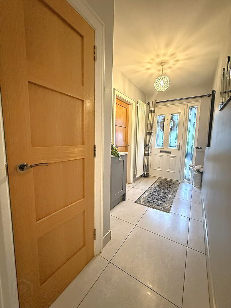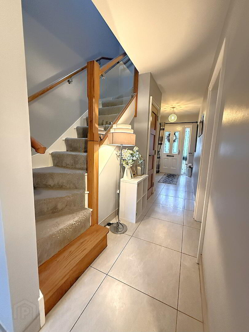Entrance hall- Tiled floor, cloakroom, store cupboard, wall mounted radiator, staircase with glazed panelling and electric meter cupboard.