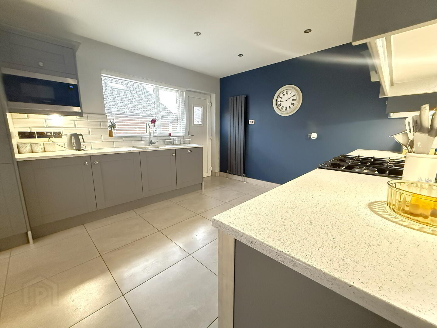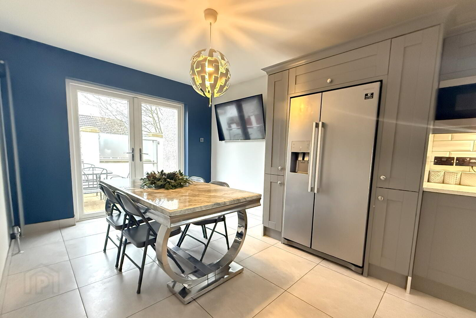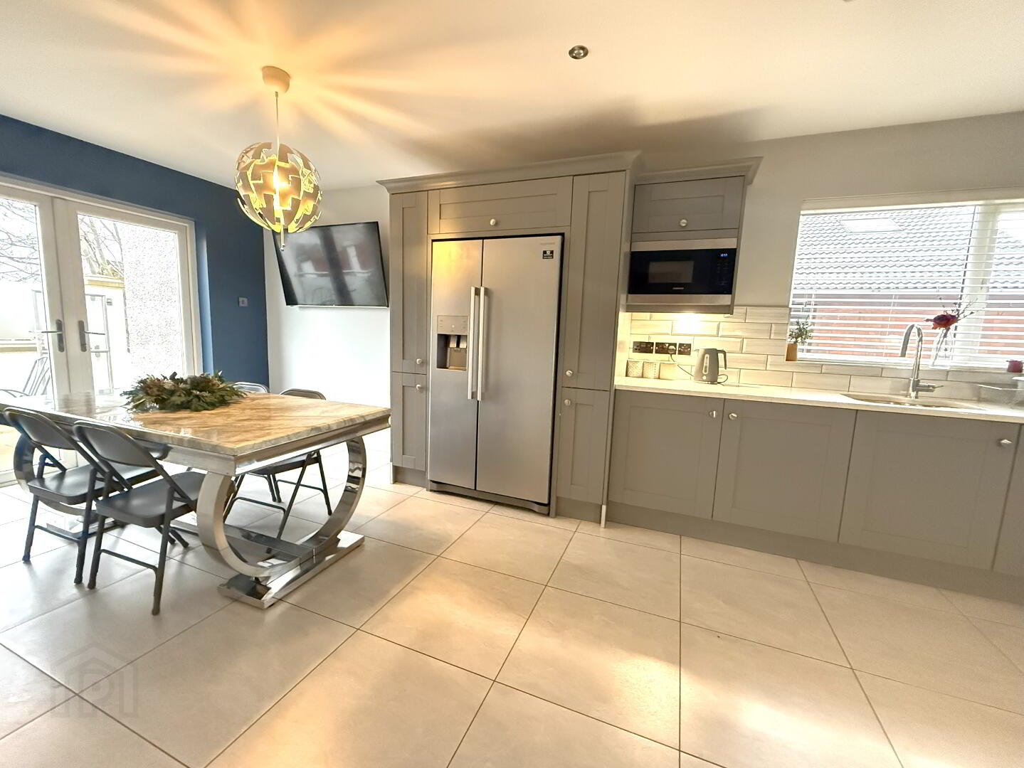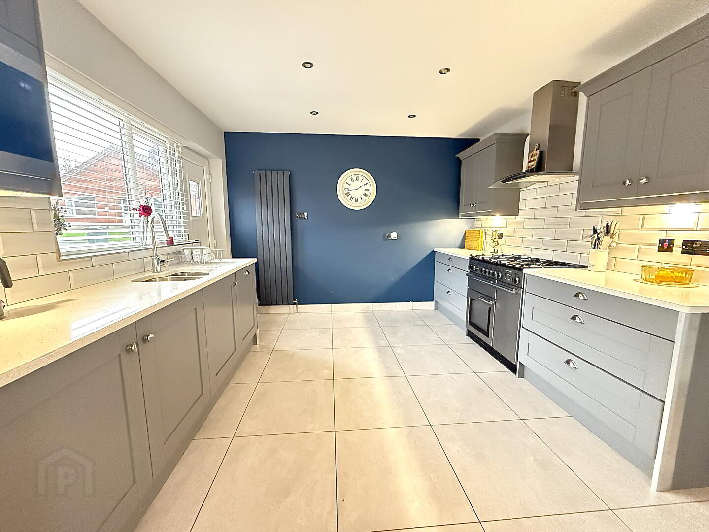 Kitchen dining area 7.26m x 3.45m (widest point)- Luxury Ash grey shaker style fitted kitchen with integrated dish washer, quartz work tops with drainer, stainless steel one and a half bowl sinks wand mixer tap, Rangemaster cooker with 5 ring gas hob, stainless steel extractor canopy, feature under lighting and low energy recessed lighting, wall mounted radiators in anthracite, tiled floor and splash back, double pvc doors to rear and single pvc door to side.