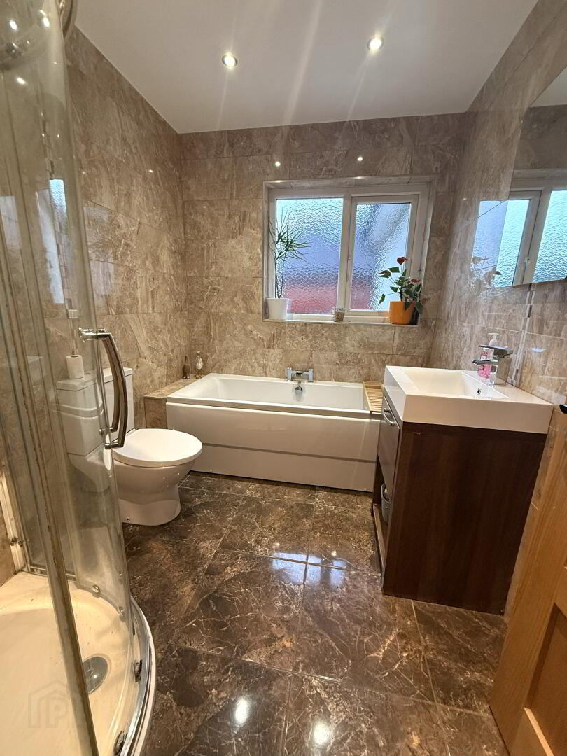 Main Bathroom - Comprised of WC, Vanity unit with basin, bath, shower cubicle, chrome towel tail, low energy recessed lighting, tiled floor and splash back.