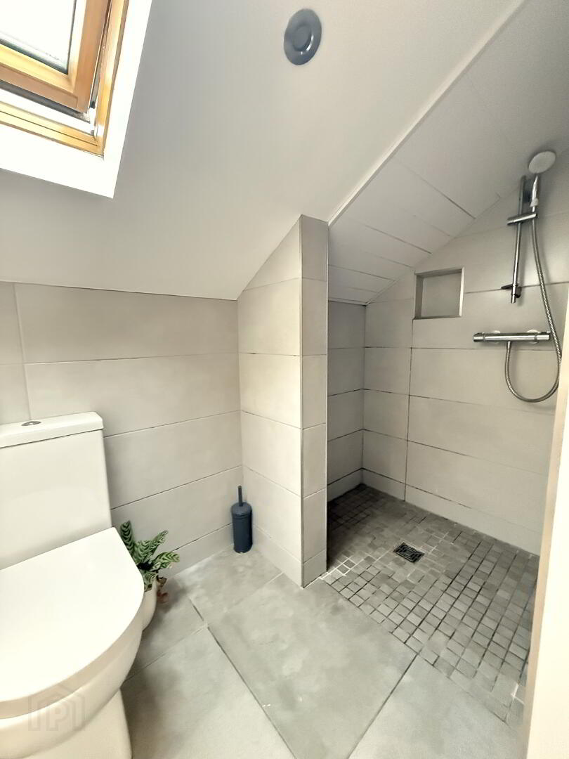Shower room - With tanked wet room shower area, vanity unit with basin, WC, chrome towel rail, recessed low energy lighting, extractor fan, tiled floor and walls.