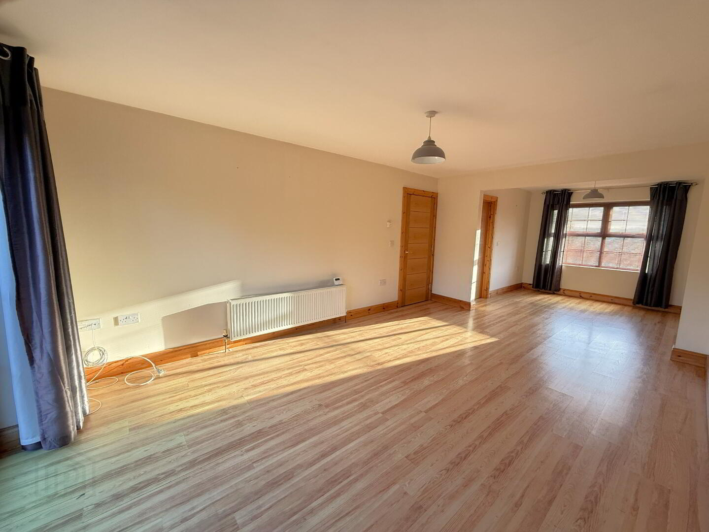 Living room. 5.26m x 3.5m with laminate flooring and double pvc doors to faux balcony. Open plan archway to :