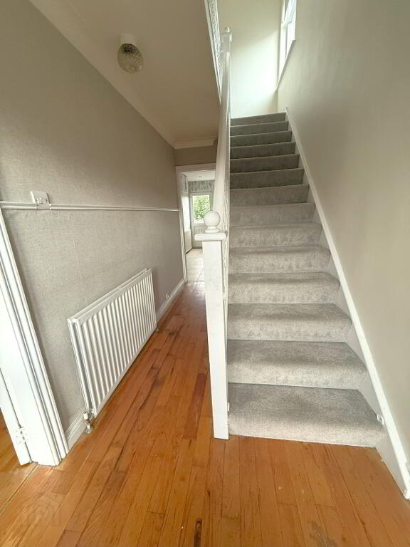 Entrance hall wood flooring, cornice ceiling and under stairs cupboard.