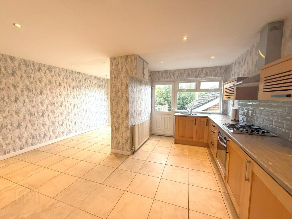 Kitchen 4.12m x 2.45m range of high and low level units,1 and a half bowl stainless steel sink and drainer, stainless steel extractor fan, integrated gas hob and oven, plumbing for washing machine, tiled splash back and flooring, open plan to:-