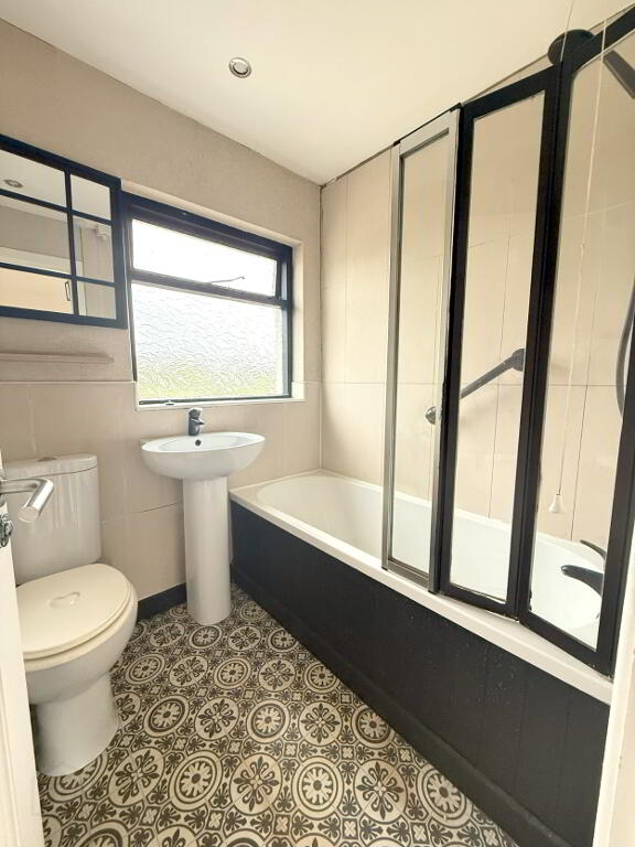 Bathroom comprised of wc, wash hand basin, bath electric shower, tiled splash back.