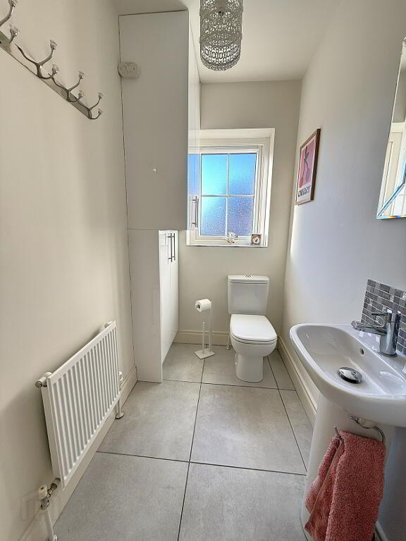 Downstairs WC - Comprised of WC, wash hand basin, tiled floor and splash back, gas boiler cabinet.