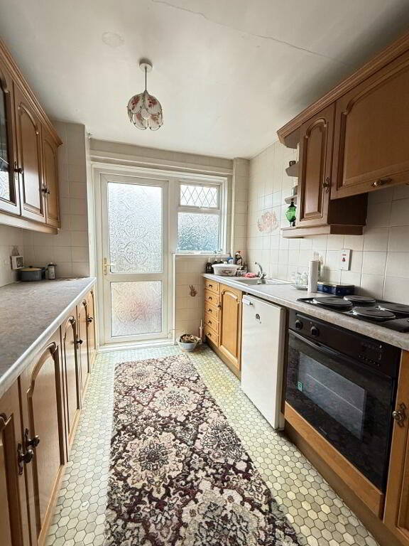 Kitchen - 2.58m x 2.38m - Oak style kitchen with good range of high and low level units, integrated hob, oven, extractor fan, tiled walls, stainless steel sink with drainer.