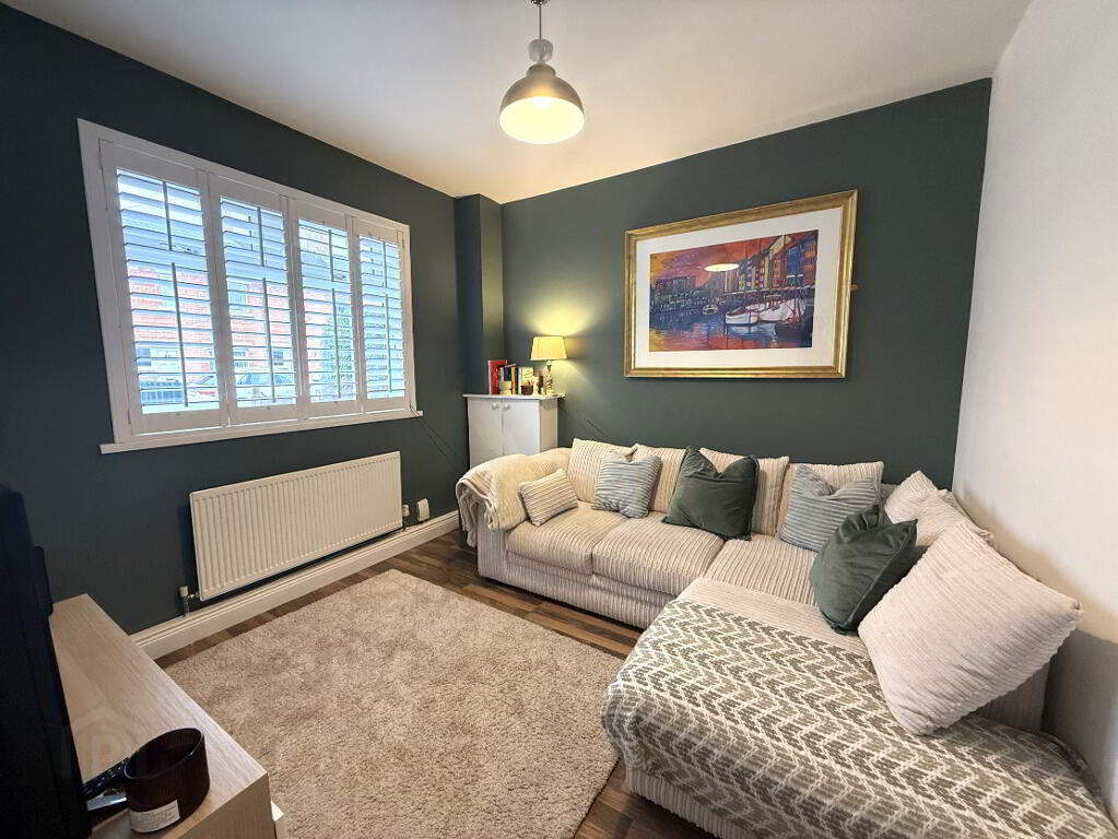 Living room (2.89m x 2.87m) Features laminated wooden effect flooring and an attractive window shutter creating a stylish and cosy space.
