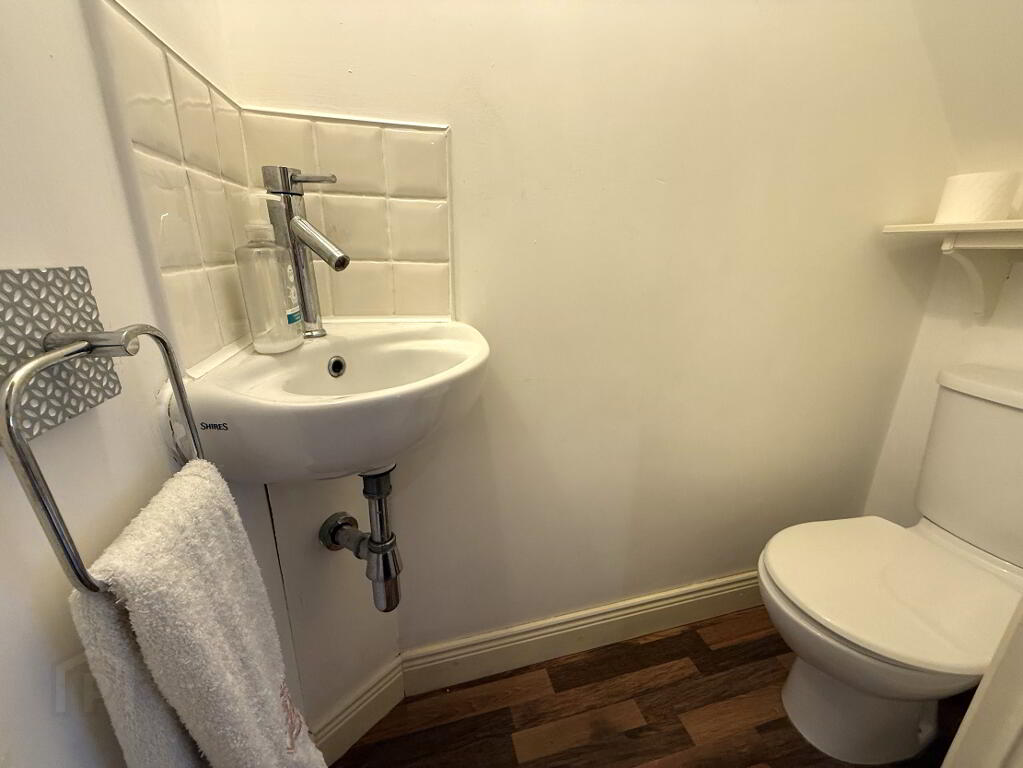 A welcoming entrance hall with laminated wooden effect flooring, painted walls, stairway with runner style carpeting. A convenient down stairs WC is fitted with a wash hand basin, WC and towel rail