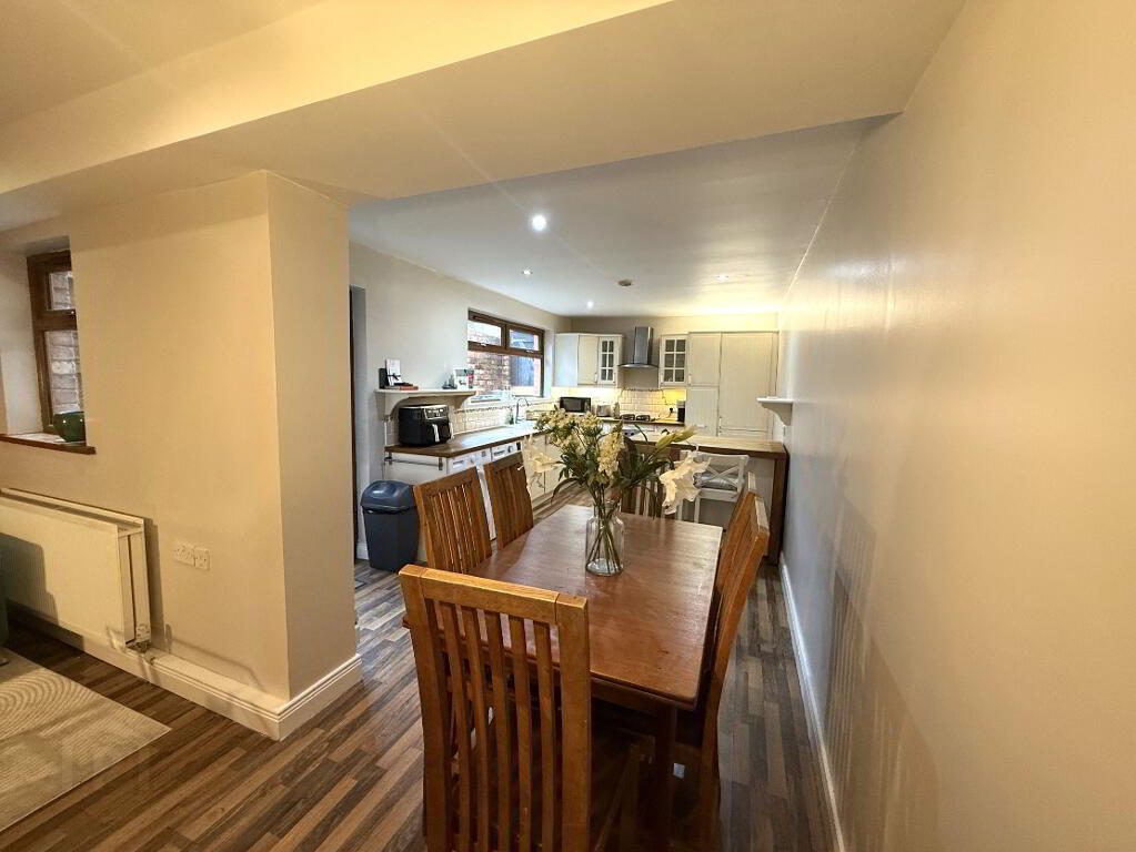Open plan dining area which flows through to the modern fitted kitchen (5.35m x 3.02m). Shaker style fitted kitchen with a good range of high- and low-level units with feature island, laminate wooden effect flooring, Belfast style sink, gas hob, extractor fan, tiled splash back, integrated fridge and freezer and built in washing machine. Pvc back door to rear yard.