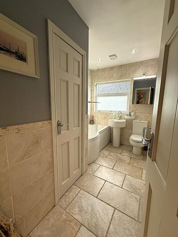 Bathroom. Comprising WC, wash hand basin and bath with shower door, tiled floor and walls, extractor fan, hot press with gas boiler, recessed lighting and towel rail.