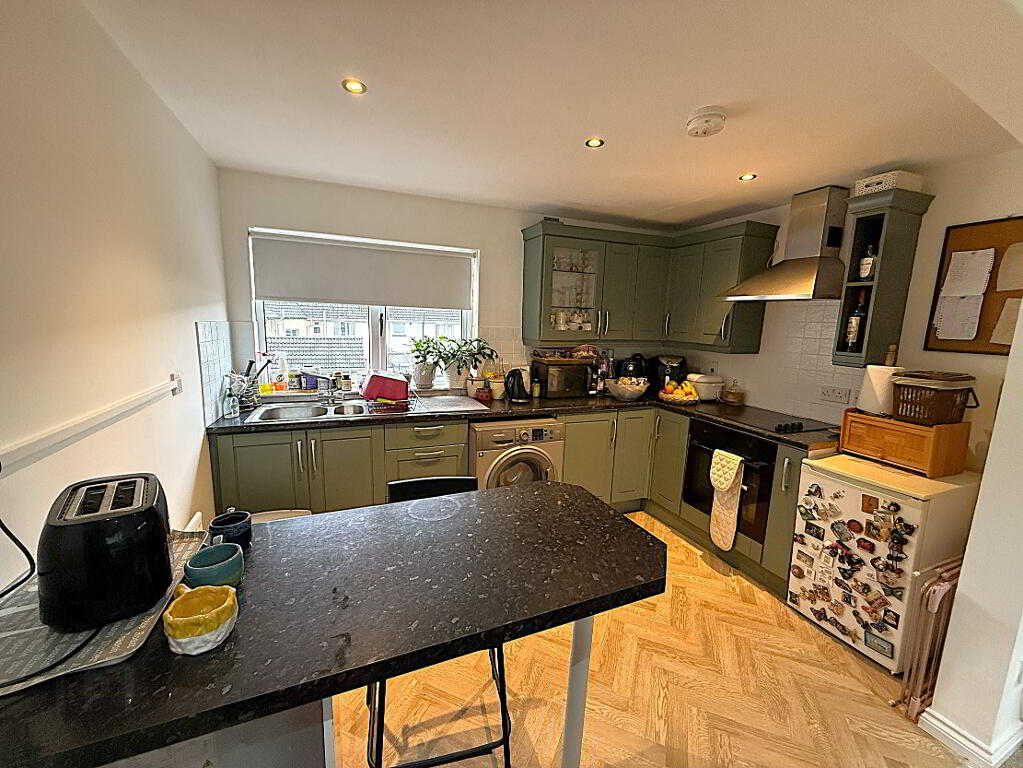 Kitchen 3.37m x 2.34m - Kitchen with good range of high and low level units. Built in hob oven and stainless steel extractor, one and a half bowl stainless steel sink, breakfast bar and tiled splash back, recessed low energy lighting.